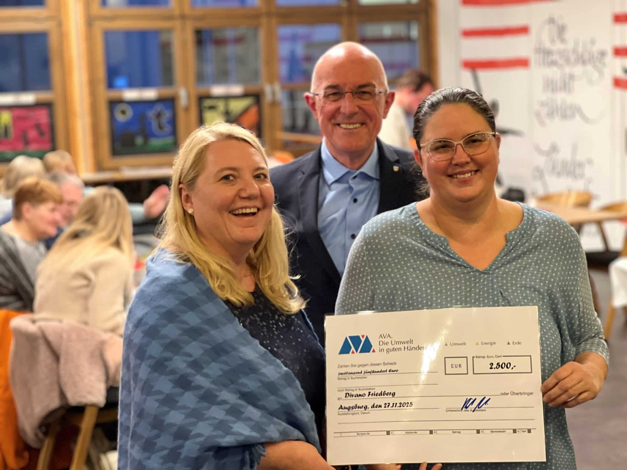 Landrat Dr. Klaus Metzger überreichte den symbolischen Spendenscheck an Sabine Tyroller, Verwaltungsleiterin der Pfarrei St. Jakob Friedberg, und Stefanie Widmann, Leiterin des Divano. Die Mittel stammen aus dem Gewinn des abgelaufenen Geschäftsjahres der Abfallverwertungsanlage Augsburg (AVA), die gemeinsam von der Stadt Augsburg sowie den Landkreisen Augsburg und Aichach-Friedberg getragen wird. Ein Teil des jährlichen Überschusses steht dem Landrat zur Förderung gemeinnütziger Einrichtungen im Landkreis zur Verfügung.