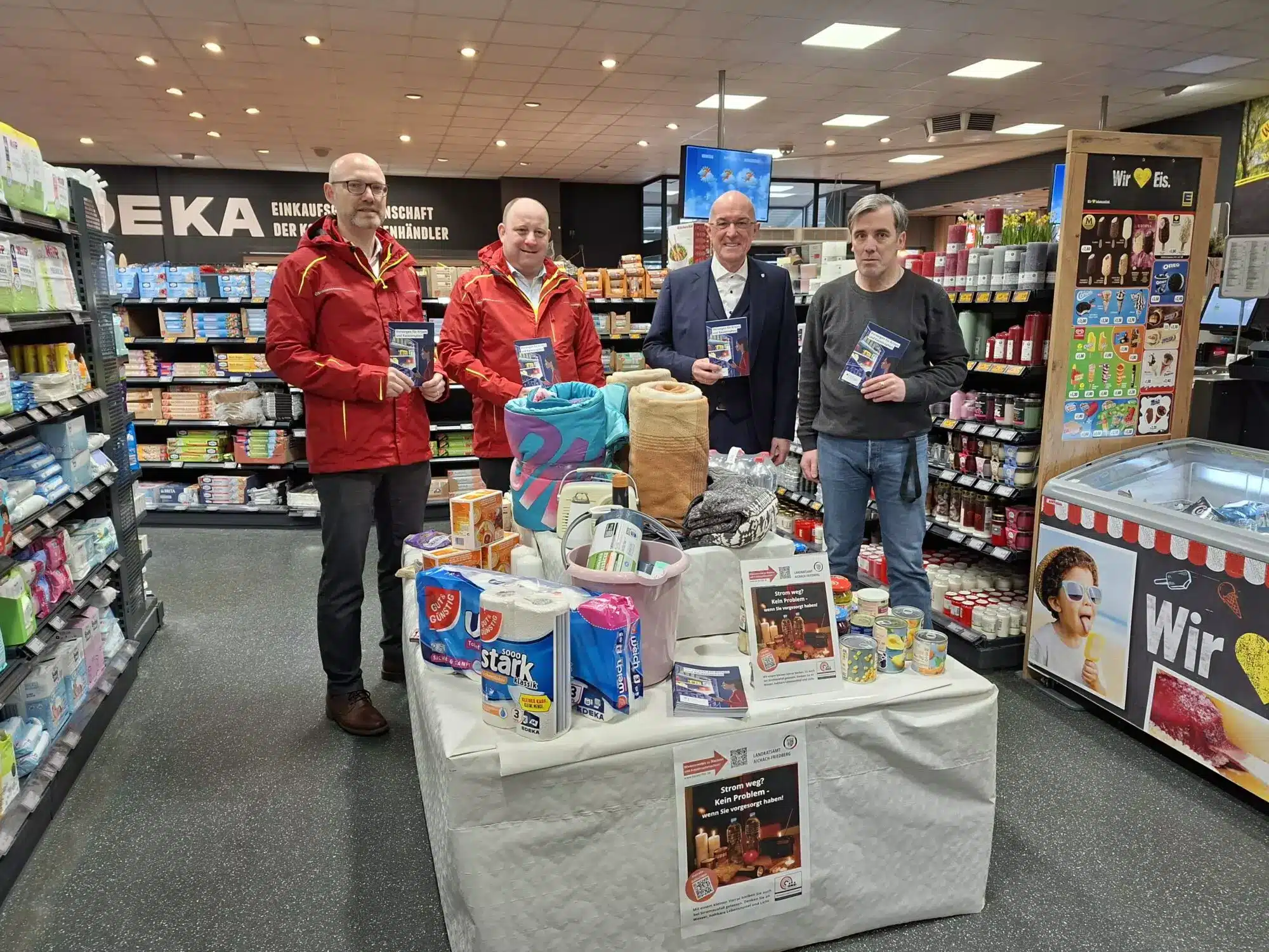 Bild (© Landratsamt Aichach-Friedberg, Melanie Royer): Läuteten die Aktionswoche zur Blackout-Vorsorge am gestrigen Montag ein: Bors Peter (Leiter Abteilung Öffentliche Sicherheit am Landratsamt), Peter Wolf (Sachgebiet Katastrophenschutz am Landratsamt), Landrat Dr. Klaus Metzger und Michael Wollny, Betreiber von Edeka Wollny in Friedberg.
