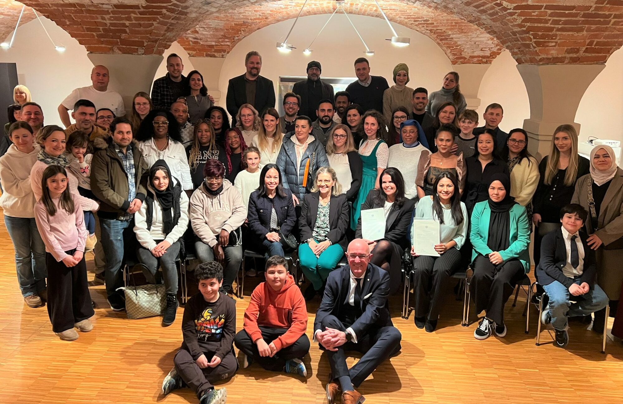 Eine Einbürgerung ist ein einschneidendes Ereignis im Leben, nach einer bewussten Entscheidung für die jeweilige Staatsangehörigkeit. Um diesem bedeutenden Schritt einen angemessenen, würdigen Rahmen zu geben, haben Landrat Dr. Klaus Metzger und das Team der Einbürgerungsstelle im Landratsamt die Personen im Landkreis, denen in den letzten zwölf Monaten die deutsche Staatsbürgerschaft verliehen wurde, zu einer Einbürgerungsfeier eingeladen. Diese Einladung fand großen Anklang, mehr als 120 Menschen sind ihr ins Kreisgut in Aichach gefolgt, 20 davon erhielten ihre Einbürgerungsurkunde auf eigenen Wunsch erst an diesem Abend, aus den Händen des Landrats. „Das ist sicher ein feierlicher, bleibender Moment im Leben jedes und jeder einzelnen von Ihnen“, sagte der Landrat. Die Einbürgerung sei ein wichtiger Schritt zur bestmöglichen und nachhaltigen Integration. „Sie bekennen sich zur freiheitlich demokratischen Grundordnung und sind nun vollberechtigter Bestandteil unserer Gesellschaft – deutsche Staatsbürgerin, deutscher Staatsbürger.“