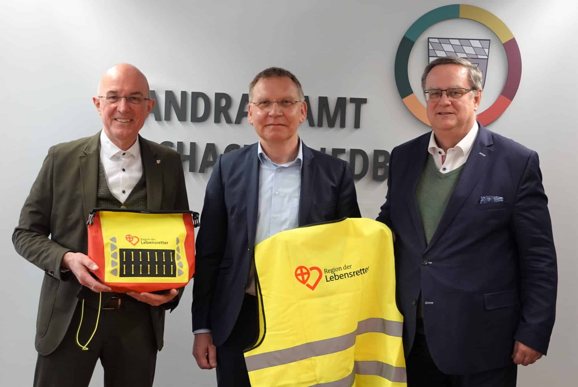 „Hinter“ Prof. Dr. Axel Heller (Mitte) vom Universitätsklinikum Augsburg und der Initiative „Region der Lebensretter“ stehen Landrat Dr. Klaus Metzger (links) und Dr. Hubert Mayer, Geschäftsführer der Kliniken an der Paar – in jeder Hinsicht (Bild © Landratsamt Aichach-Friedberg, Wolfgang Müller). Bei einem Herzstillstand zählt jede Sekunde. Die App „Region der Lebensretter“ alarmiert qualifizierte ehrenamtliche Ersthelfer über die Rettungsleitstelle und kann Leben retten, noch bevor der Rettungsdienst eintrifft. Nun soll dieses bewährte System auch im Rettungsdienstbereich Augsburg, zu dem neben dem Stadtgebiet auch die Landkreise Augsburg, Aichach-Friedberg, Dillingen und Donau-Ries gehören, eingeführt werden. Das Projekt wird unterstützt von der Uniklinik Augsburg, den Hilfsorganisationen, Feuerwehren und Krankenhäusern der Region. Prof. Dr. Axel Heller, Direktor der Klinik für Anästhesiologie und Operative Intensivmedizin am Universitätsklinikum Augsburg, stellte diese lebensrettende Einrichtung nun Landrat Dr. Klaus Metzger und dem Geschäftsführer der Kliniken an der Paar, Dr. Hubert Mayer, im Detail vor und kann auch auf deren Unterstützung zählen. „Die „Region der Lebensretter“ ist eine wertvolle Ergänzung zu anderen Alarmierungssystemen, weil dadurch die Zeiten bis zur ersten Hilfeleistung vor Ort verkürzt werden könnten. Alles, was hilft, Leben zu retten, ist unterstützenswert. Der Landkreis ist gerne mit dabei!“, so Metzger. Mit dem App-basierten System des Vereins Region der Lebensretter e.V. werden über Smartphone registrierte Ersthelfende in der unmittelbaren Nähe des Notfalls geortet und alarmiert. Diese professionellen Retter, die in den ersten 3-5 Minuten nach einem Herz- Kreislaufstillstand eintreffen, können die Überlebenschance der Patienten verdoppeln bis vervierfachen. Durch das intelligente Zusammenspiel aller Komponenten des Systems „Region der Lebensretter“ könnten jedes Jahr in Deutschland zusätzlich 10 000 Leben gerettet werden, viele davon ohne jede Beeinträchtigung. Wichtiger Faktor für einen erfolgreichen Rettungseinsatz bei einem Herz-Kreislaufstillstand ist, einen Defibrilator möglichst in greifbarer Nähe zu haben. „Ungefähr ein Viertel der Menschen mit einem außerklinischen Herz-Kreislaufstillstand kann vom Einsatz eines automatisierten externen Defibrillators profitieren“, erklärt Heller. Laut wissenschaftlichen Untersuchungen steigen die Überlebenschancen der Betroffenen sogar auf über 75 Prozent, wenn innerhalb von drei Minuten nach Eintritt des Herzkammerflimmerns eine Defibrillation durchgeführt wird. Aus diesem Grund bitten der Landrat und Professor Heller darum, alle Defibrillatoren im Landkreis Aichach-Friedberg, die öffentlich zugänglich sind, zu melden. In dem Portal https://regionderlebensretter.de/aed-melden können die „Defis“ direkt eingetragen werden, mit Angaben zu Standort- und Zugang sowie Fotos. „Wir beraten die Betreiber, wie sie Ihren AED für Ersthelfer 24/7 verfügbar machen können“, sagt Heller. Weitere Informationen unter https://regionderlebensretter.de