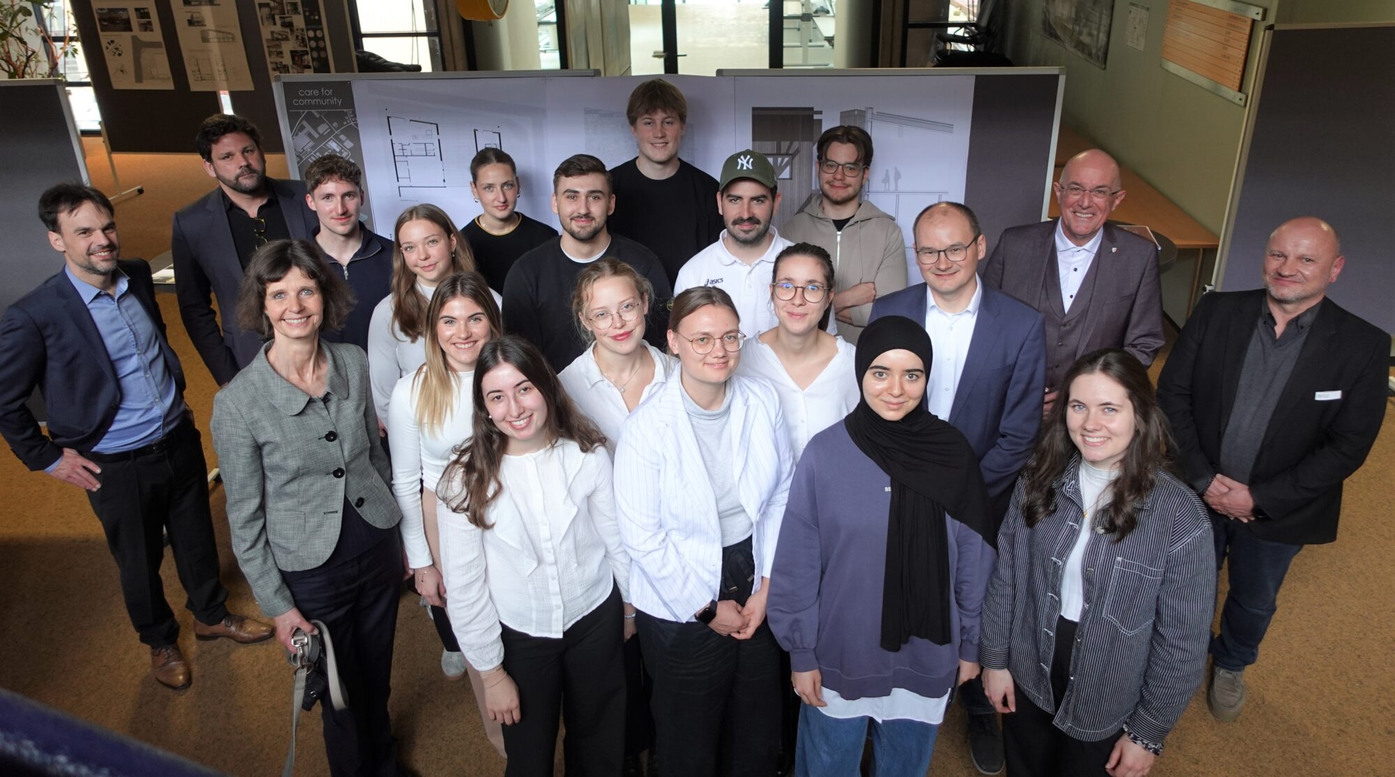 Studentinnen und Studenten der Technischen Hochschule Augsburg präsentierten mit Prof. Dr.-Ing. Sergej Rempel (3.v.r.), Prof. Susanne Runkel (2. Reihe 1.v.l.), Prof. Dr.-Ing. Christopher Robeller (1.v.l.) und Prof. Wolfgang Huß (2.v.l.) Landrat Dr. Klaus Metzger (2.v.r.) ihre Entwürfe im Landratsamt, wo sie noch bis Ende April zu sehen sind. Ganz rechts Manuel Hitzler, Leiter des Sachgebiets Hochbau im Landratsamt (Bild © Landratsamt Aichach-Friedberg, Wolfgang Müller). Im Kreisbauhof in Ecknach wurde das Platz- und Ausstattungsproblem bis auf weiteres mit einer Übergangslösung aus Containern behoben. Wie der Kreisbauhof der Zukunft eventuell einmal aussehen könnte, darüber durften sich Studentinnen und Studenten der Technischen Hochschule Augsburg ausprobieren und ihrer Kreativität dabei freien Lauf lassen. Die Ergebnisse sind aktuell im Foyer des Landratsamts auf mehreren Schautafeln zu sehen. Die Entwurfsverfasser stellten sie Landrat Dr. Klaus Metzger selbst vor, der von der jungen Planergeneration sichtlich beeindruckt war und sich darin Impulse für künftige Realisierungen vorstellen konnte. Der Landrat selbst hatte Ende 2023 angeregt, für künftig potenziell anstehende Baumaßnahmen des Landkreises das Technologietransferzentrum (TTZ) Aichach der Technischen Hochschule Augsburg einzubeziehen. Studierenden soll so ermöglicht werden, an realen Objekten des Landkreises Studienarbeiten durchzuführen bzw. Entwürfe zu erstellen. Als erstes Objekt wurde dafür der Kreisbauhof Aichach ausgewählt. Eingebunden waren Studierende der Studiengänge Energieeffizientes Planen und Bauen, „Digitaler Baumeister“ und Architektur, zwischen dem zweiten und dem sechsten Semester. Sie führten verschiedene „Machbarkeitsstudien“ für eine mögliche Sanierung bzw. Erweiterung des Kreisbauhofs Aichach aus. Das Sachgebiet Hochbau am Landratsamt begleitete die Studienarbeiten im Laufe des letzten Jahres. Ausgewählte Entwürfe dieser Arbeiten werden bis Ende April im Foyer des Landratsamtes in Aichach öffentlich ausgestellt. Federführend hatte der wissenschaftliche Leiter des TTZ Aichach, Prof. Dr.-Ing Sergej Rempel, von der Fakultät für Architektur und Bauwesen an der TH Augsburg, den Kontakt zu den einzelnen Professoren-Kollegen der verschiedenen Studiengänge hergestellt. Das TTZ in Aichach ist spezialisiert auf die Themen digitales Planen und Fertigen im Bauwesen, um einen wichtigen Beitrag zu einer nachhaltigen und zukunftsfähigen Bauindustrie zu leisten. In enger Kooperation mit Unternehmen werden in den Fachbereichen Massivbau und Digitaler Holzbau innovative Lösungen für reale Bedarfe entwickelt. Geforscht wird an alternativen Materialien im Betonbau und an Produktionsmethoden im Massivbau. Im digitalen Holzbau geht es um die Entwicklung automatisierter Fertigungsprozesse und digitaler Planungstools. Eng eingebunden sind Studierende der THA, www.tha.de/TTZ-Aichach.