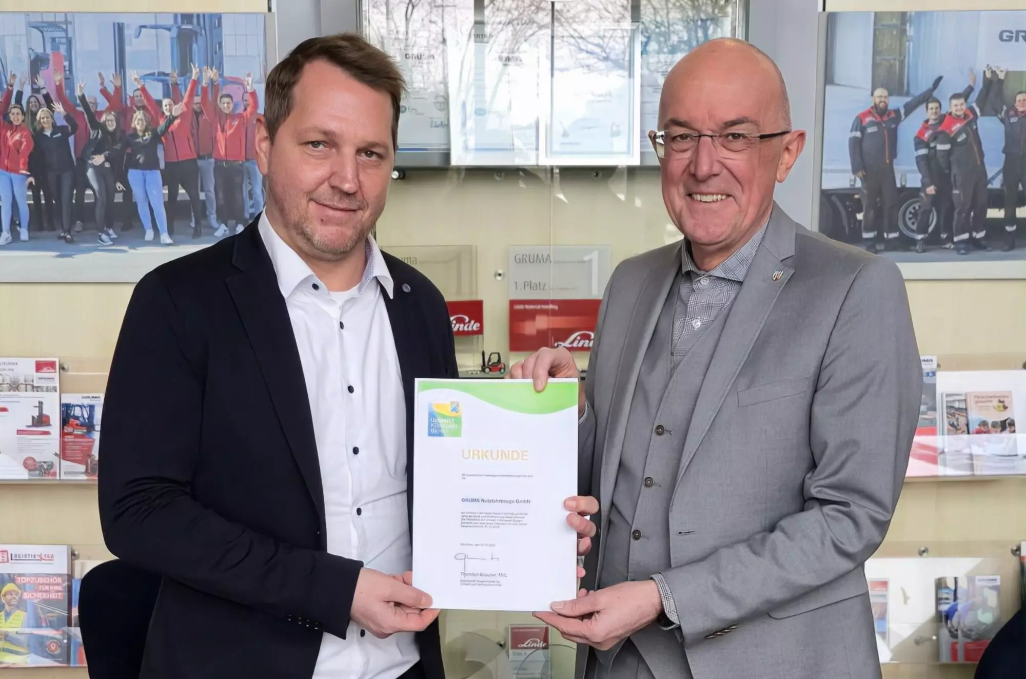 Für ihr besonderes Engagement im Umwelt- und Klimaschutz wurde die GRUMA Nutzfahrzeuge GmbH in Friedberg mit der Teilnahme-Urkunde des Umwelt- und Klimapakts Bayern ausgezeichnet. Landrat Dr. Klaus Metzger überreichte die Urkunde im Auftrag des Bayerischen Staatsministeriums für Umwelt und Verbraucherschutz an Florian Wolf von der Firma GRUMA.