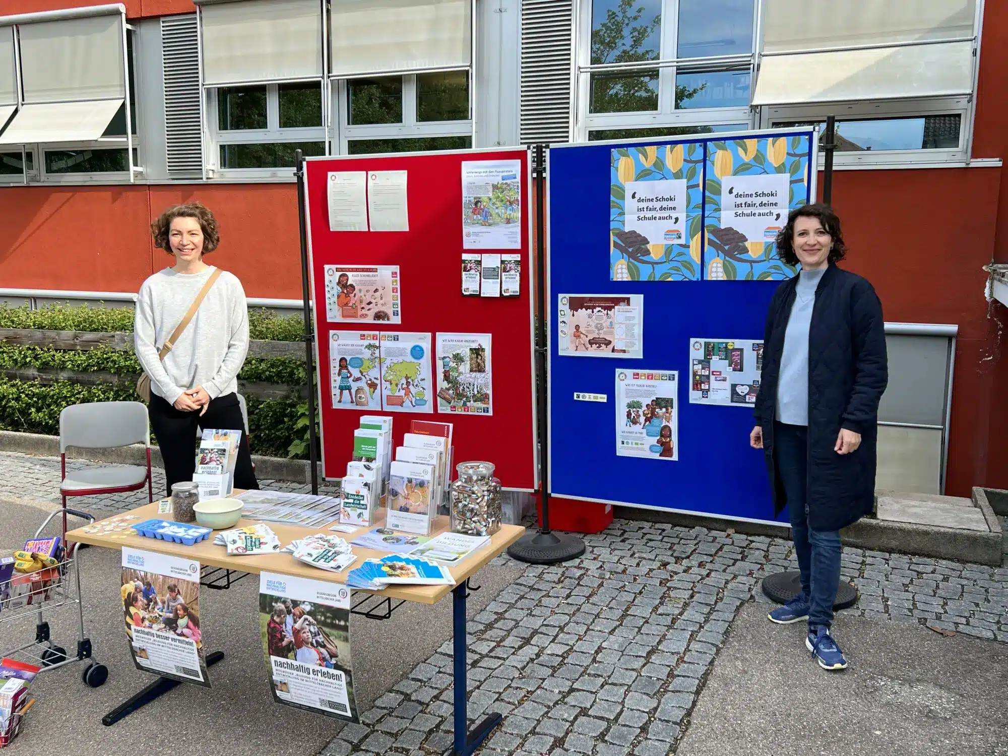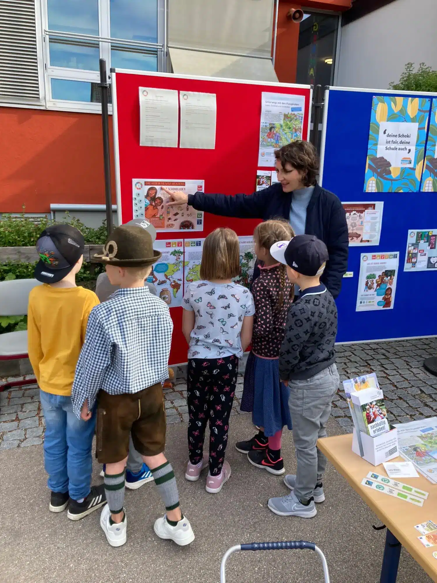 Beim Frühlingsfest an der Theresia-Gerhardinger-Grundschule in Friedberg war unser Bildungsbüro mit dem Schwerpunktthema Bildung für nachhaltige Entwicklung (BNE) vertreten. Die beiden Bildungsmanagerinnen Luna Winter und Dr. Eva Rösch ließen interessierte Kinder in Mitmachstationen in die Welt des Kakaos und der Schokolade eintauchen. Die Jüngsten konnten dabei spielerisch die Beschaffenheit von Leckereien entdecken („So viel Zucker in einer Schokolade?“) und erfuhren Spannendes zu Landeskunde und Botanik („Oh, Kakaobohnen sind ja erst mal weiß, bevor sie braun werden!“).